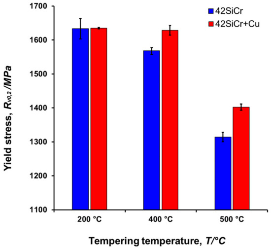 Yield stress RVp0,2 of steels 42SiCr and 42SiCr + Cu tempered for two hours.
