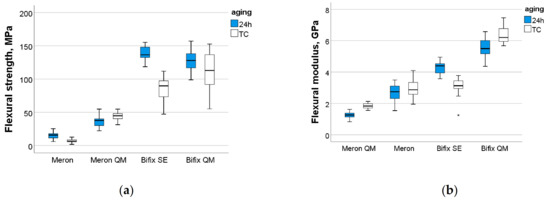 After storage for 24 h, the FM and FS values decreased significantly in the material sequence Bifix SE < Bifix QM < Meron Plus QM < Meron. This sequence was maintained after aging, with the amendment that the FM of Bifix SE and Meron were statistically similar (p = 0.799).
