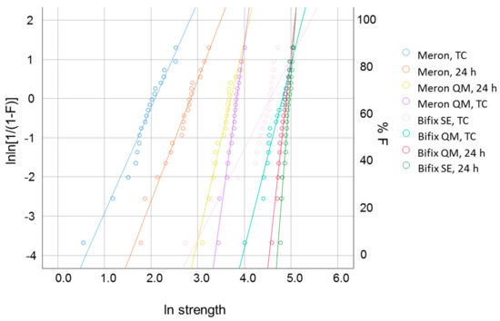 Parameters measured in the three-point bending test and the corresponded Weibull moduli are illustrated in Table 2 and Figure 1 and Figure 2. Samples made from Provicol failed when inserted into the testing device, while those exposed to thermal aging failed during this procedure.
