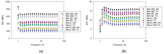 The quasi-static parameter HIT increased significantly in the sequence Meron, TC < Meron, 24 h < Meron QM, TC < Bifix SE, TC < Bifix SE, 24 h < Meron QM, 24 h < Bifix QM, TC < Bifix QM, 24 h (Figure 4a), while values measured in the RBC Bifix QM were up to three times higher than in the GIC (Meron). The highest HIT values were recorded for all materials at a frequency of 1 Hz. With the following frequency, the HIT values dropped to a plateau. This jump was smaller in the GIC than in the resinous materials. Aging significantly reduced the HIT in all materials and at all frequencies.