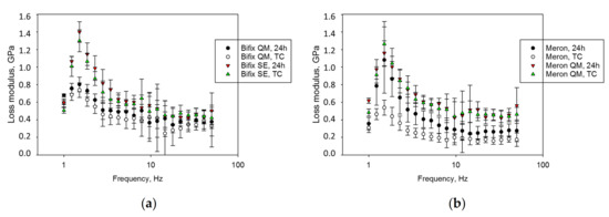 Variation of the loss modulus (E″) over the frequency range 1–50 Hz for (a) Bifix QM and Bifix SE; (b) Meron and Meron QM.