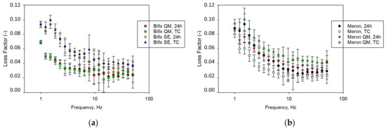 The loss factor (tan δ) decreased steadily up to 11.8 Hz to a plateau in all analyzed materials (Figure 6). Over the analyzed frequencies, tan δ decreased in the sequence (Bifix QM, TC; Bifix QM, 24 h; Meron, TC; p = 0.99) < (Meron, 24 h; Meron QM, 24 h; p = 0.99) < Bifix SE, 24 h < (Bifix SE, TC; Meron QM, TC; p = 0.961).