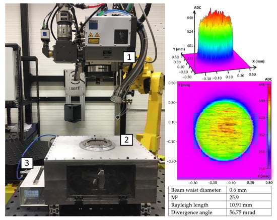 In this paper, the fabricated samples were characterized by an initial roughness >1 µm (measured in Section 3.2 and a height of surface asperities much greater than the maximum re-melting depths that are available for LµP. Thus, a continuous wave laser was utilized to conduct the LP. The TruDisk 8001 (Trumpf, Ditzingen, Germany) solid-state Yb:YAG laser, emitting radiation up to 8 kW with a central wavelength of 1030 nm, was connected via optical fiber to a dedicated laser galvo head: PFO-33 (Trumpf), mounted on a six-axis robotic arm M-710iC70 (Fanuc) (Figure 2 left). The PFO-33 was positioned at the distance of 450 mm from the sample, which is equal to the effective focal length of the f-theta lens. Additionally, the Crossjet TL120 S0.25 (Trumpf) was used to protect the objective from the spatters and vapor from the process. The air pressure blowing though the crossjet nozzle was 4.5 bar, and the distance from the nozzle to the objective was set to 140 mm. The beam parameters were calculated from the laser beam caustic that was measured using the FocusMonitor (Primes, Pfungstadt, Germany) system. The beam’s waist and parameters were compiled using LaserDiagnosticsSoftware (Primes, version 2.98.81), with the results being presented in Figure 2 (right). The system uses a laser beam that was characterized by a top-hat distribution, which is generally considered to be more suitable for LP applications due to the fact that there is a more uniform temperature distribution on the surface [9].