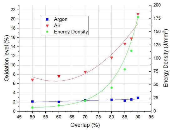 The EDS analysis was conducted on a 4 mm × 4 mm area on every sample from Table 2. Areal analysis allowed for the oxygen content on the polished surface to be estimated and, therefore, the oxidation level of the surface to be determined (Figure 4). Generally, EDS is not a perfect solution of performing quantify estimation of light elements (such as oxygen or carbon) with high accuracy. Instead, these analyses were only made within the context of qualitative studies and, thus, to compare the oxidation level for different samples. It is worth mentioning that, due to the EDS principle of operation, the chemical analysis in this section is not performed on the whole oxidation layer, but, instead, on a thin layer of approximately 1 µm. When the process is conducted in the argon chamber, the overlap has a minor influence on the oxidation level, slightly varying from the oxidation level on the initial surface (measured for approximately 2%), as shown in Figure 4. However, when no shielding atmosphere is applied, oxidation increases exponentially with the overlap. An explanation for this would be that the change in overlap is related to the ED and processing/interaction times. This simply means that for the same area of 1 cm2, and the same laser parameters (power, scanning speed), more energy is applied, in turn causing higher local heat accumulation on the surface to occur [28]. Moreover, with regards to the oxidation kinetics, the mass gain (linked to the oxidation level) increases with temperature, which naturally results in higher oxygen content readings.