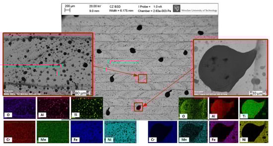 The values of the equilibrium partial pressures of the oxygen at the melting point for the aluminum and titanium is 10−58 atm and 10−10 atm, respectively, which means that the oxygen content inside the argon process chamber should be lower than 10−52 ppm (for Al) and 10−4 ppm (for Ti) in order to completely avoid the formation of Al2O3 and TiO2. When considering industry-grade inert gas, this rigor is clearly impossible to fulfil in non-lab conditions [49,50]. As expected, the 25 ppm oxygen content utilized in the process chamber was not low enough to prevent the aluminum and titanium from oxidation. Moreover, these oxides can rarely be spotted on samples processed in an argon atmosphere, which can be seen on the representative sample from trial 5.a (Figure 7). The microcracking effect was not noticed in the samples that were polished in the argon chamber.