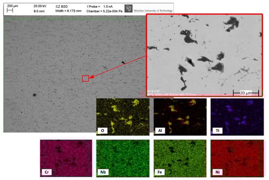 The oxidation tendency of the elements included in IN718 is greatest for Al, Cr, Fe, Ti, and Ni, respectively, according to the Ellingham diagram. Therefore, these elements are most likely to form Al2O3, Cr2O3, FeO, TiO2, and NiO on the IN718 surface [49]. Further EDS investigations of 1.o sample (Figure 5) revealed that Al and Ti oxides can appear in the form of both single spots with a diameter more than 100 µm (Figure 5 right), and multiple small spots with a diameter of approximately 10 µm (Figure 5 left). After utilizing the high contrast in the photo, these oxides appear to be black, while the white-grey areas can be considered to be the least oxidize, since their chemical composition is close to the original IN718. As shown in the example in Figure 5 (right), microcracks occur on larger oxides, while, on smaller ones (Figure 5 left), this effect was not noticed. The formation of the of Al2O3 and TiO2 on IN718 in the melting regime was previously noticed by Gasper et al. in the context of the Laser Powder Bed [50], by Sanviemvongsak et al. in the context of Laser Beam Melting [39], and by Zhang et al. in the context of Direct Laser Deposition [49]. However, the authors, in their papers, utilized shielding gas and, therefore, these oxides appeared to be much smaller in size than the ones that were observed in this study, with similar cracking effects not being observed. A possible explanation for the formation of such large Ti and Al oxides could be related to the surface tension and temperature on the surface. When no shielding atmosphere is applied, the formation of these oxides is massively increased and they do not diffuse into bulk, because their melting point could not be reached (2072 °C for Al2O3 and 1843 °C for TiO2). Finally, these oxides can accumulate into larger structures due to the surface tension.
