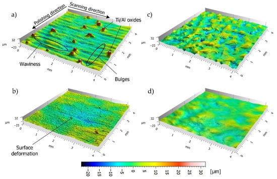 Laser Polished surface topographies recorded by white-light interferometry: (a) OL = 50% (air, 1.o), (b) OL = 85% (air, 5.o), (c) OL = 50% (argon, 1.a), and (d) OL = 85% (argon, 5.a).