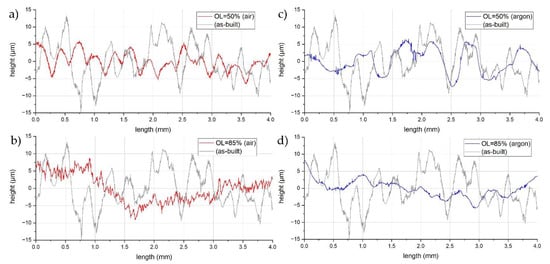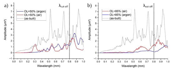 When the zigzag strategy is applied, periodic surface components will change with the utilized overlap [23]. In this case, the PSD function was used in order to show the distribution of power of all the periodic components on the surface created after the LP in the direction perpendicular to the scanning direction. Additionally, the horizontal axis was inverted from the frequency to the wavelength domain (λ = 1/f) for a better understanding of the occurring components. Figure 12a shows that, for the sample polished in the argon chamber, higher frequencies (shorter wavelengths) are significantly reduced when compared to the as-built surface. However, a high gain is still observed above the cut-off value (waviness). The same process that was conducted in the air atmosphere resulted in the amplification of the wavelength by approximately 0.3 µm (equal to the hatching pitch), which is the direct result of the formation of periodic bulges (see Figure 8a and Figure 9a). Increasing the overlap to 85% resulted in a significant reduction in higher frequencies for the LP that was conducted in the argon chamber (Figure 12b, blue). For the LP conducted in air (Figure 12b, red), the peak at 0.3 µm was reduced due to the fact that the periodic bulge structures are no longer dominant. However, lower frequencies were not reduced, but instead amplified. This is due to surface overheating, which results in surface deformation and, in turn, increased waviness.