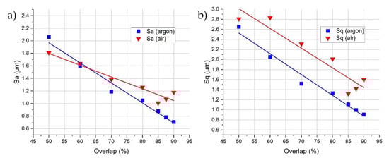 Roughness analysis (Figure 10) reveals that an almost equal mean surface roughness (Sa) is achieved for OL = 50% for both the argon and air atmospheres (2.06 and 1.81 µm, respectively). For the argon trial (1.a), the increasing overlap results in an almost linearly decreased Sa. Moreover, the best results can be achieved for higher overlaps, which generally proves the findings that were presented by Rosa et al. [24], Bhaduri et al. [21], and Hafiz et al. [23]. However, in the case of air, the lowest roughness is achieved for 85% overlap, which is contrary to the argon experiment, in which the roughness increases above this value. This may be a result of the surface overheating and melt-pool instability.