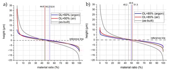 The material’s relocation mechanism is linked with the laser thermal energy process (LP) and it might lead to the non-uniformity of the distribution of amplitudes (peaks and valleys). This is the result of the forming of material- and process-induced surface structures during melt-pool re-solidification [14,23]. Therefore, the Abbott–Firestone curve can be used to obtain information regarding the percentage distribution of the asperities over the analyzed surface. For the as-built sample (Figure 11a,b, gray), 45.2% of the material is localized above the reference line, and 54.8% of the material is localized below the reference line. The curve is characterized by similar slopes in the upswing and downswing regions. After applying LP with OL = 50% in the air atmosphere (Figure 11a, red), the ratio changed insignificantly to 44.6% and 55.4% for the above and below reference lines, respectively. However, the slope in the upswing is steeper due to the occurrence of Ti/Al oxides (very few objects with a high amplitude), while, in the downswing, the slope is decreased due to the formation of bulges. Conducting the process in the argon chamber (Figure 10a, blue) resulted in a reduced heat input being applied to the surface, therefore causing the smoothing of the as-built surface. The slope of the up- and downswing became symmetrical, and the amplitude distribution ratio reached 52.6% (above) and 47.4% (below). When the overlap was increased to 85%, a uniform surface distribution was achieved for LP in both the air (51.3% and 48.7%) and argon (49.6% and 50.4%) atmospheres, and the slope of the middle section was decreased. However, the slope of the downswing, representing LP in the air atmosphere (Figure 10b, red), was not reduced when compared to OL = 50% (Figure 11a, red). This might be due to the thermal deformation of the sample as a result of the high heat input. It can be concluded that for high overlap (85%), in both the argon and air approaches, a similar amount of material occurs above and below the reference line and, therefore, the distribution of amplitudes is generally more uniform. Moreover, the surface quality was improved in all the LP trials, which is represented by the lowered slope of the middle section curve.