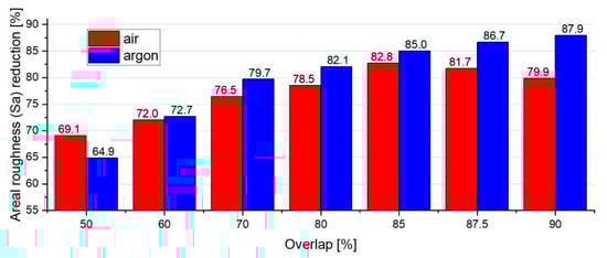 The issues that were covered in this paper were limited to the investigation of the influence of overlap on surface morphology and topography. Overlap is considered to be a crucial parameter in the case of the zigzag strategy. Further analysis consisting of the influence of process parameters on surface quality could be carried out using multivariate analysis (Design of Experiment). Finally, Table 3 shows a summary of observations of the obtained results with regards to the overlap and the impact of gas. Moreover, Figure 13 shows the average reduction in roughness (Sa) (as a function of overlap) that is possible to achieve when conducting LP in air and argon atmospheres.