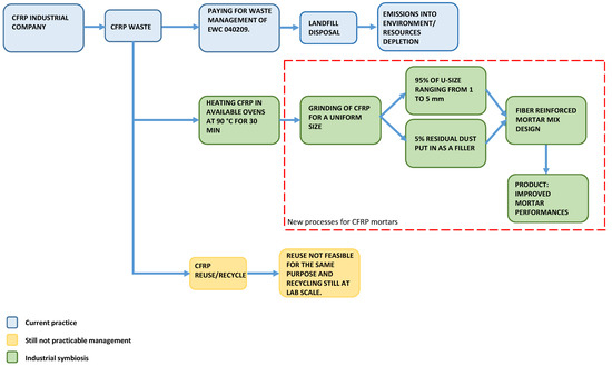 This study proposes a model, in line with circular economy objectives, capable of implementing a feasible industrial symbiosis between two sectors in a win-win scenario. On the one hand, there is the need for industrial companies using CFRP pre-preg sheets to ensure sustainable and inexpensive waste management; on the other, there is the need to move towards more sustainable cementitious products. To this aim, this paper compares the mechanical and environmental performance of an ordinary cement mortar with two types of fiber reinforced mortars; the first type contains a precise amount of carbon fiber (obtained from CFRP waste from an Italian techno-textile company) substituting for sand, whereas the second type substitutes an amount of cement with recycled CFRP fibers. An attributional and comparative LCA (life cycle assessment) [25,26] is carried out on different specimens on a lab scale, which are preliminarily tested and compared in terms of flexural and compressive strength.