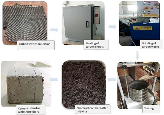 After heating, the stabilized CFRP wastes are ready to be chopped up into suitably smaller fragments that can be easily worked into mortars. In fact, the third illustration of Figure 2, refers to the grinding of CFRP heated pre-pregs, a pre-treatment operation consisting of reducing the size of the material into fragments using a mechanical grinder. Afterwards, the fibers are of different sizes, and therefore it is necessary to use a sieve in order to select fibers of the desired size range. Thus, by using a series of vertical sieves, with the opening gradually decreasing from top to bottom, the separation of grain sizes according to the selected openings is obtained. This procedure allows for the identification of the length of fiber fragments in order to define optimal CFRP mortar mixes. One of the most sensitive aspects is related to the production of a residual dust (usually around 4%) during the grinding process; nevertheless, this residual component could be introduced into the mortar as a filler. Once the fibers of the desired size have been selected, they are dry-mixed with the sand and cement; after a homogeneous dry mixture is obtained, the necessary water is added, and it is mixed again. Afterwards, the mortar is ready to be cast into molds to obtain test specimens for measurement of the mechanical properties.