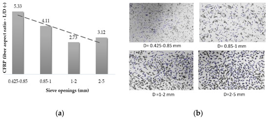 By means of a MATLAB routine (FiberApp) it was possible to report information in terms of CFRP fiber length and diameter statistical distribution (Table 2). In particular, this application allowed the processing of fiber data directly from the pictures of randomly distributed fibers placed on a flat surface after the sieving operation, as shown in Figure 3b. The statistical results are reported in terms of mean value of fiber length and fiber diameter (with the corresponding standard deviation, σ) for each range of sieve opening. It is worth noting that the mean value of the fibers’ length is larger than the dimensional range of the corresponding sieve diameter due to the oblong shape of the fibers (smaller diameter than length), which facilitates the insertion into tighter openings during the separation process. An important result was the determination of the aspect ratio of the fibers after the sieving process, i.e., the ratio between the expected value of the fiber length and diameter (shown in Table 2), which is reported by means of the histogram in Figure 3a. As the aspect ratio increases, the bonding surface between the CFRP and mortar material increases, and consequently the performance of the fiber mixture improves since the fibers subjected to tensile forces are more difficult to slip off.
