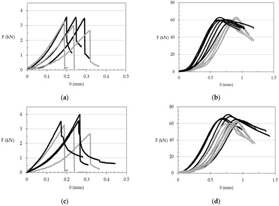 (a) Load-deflection relationship in flexural regime (grey lines: control specimens, black lines: SC-R32.5_6.4%_2–5 series); (b) load-deflection relationship in compression regime (grey lines: control specimens, black lines: SC-R32.5_6.4%_2–5 series); (c) load-deflection relationship in flexural regime (grey lines: control specimens, black lines: SS-R32.5_4%_2–5 series); (d) load-deflection relationship in compression regime (grey lines: control specimens, black lines: SS-R32.5_4%_2–5 series).