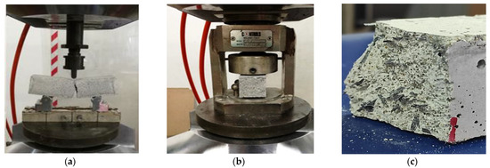 (a) Example of flexural test at failure; (b) example of compression test executed on one half of the broken flexural specimen; (c) fractured cross-section of the SS-R32.5_4%_2–5 series specimen highlighting the fiber distribution within the cementitious matrix.
