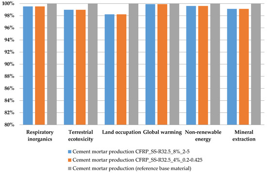 Figure 6 refers to the characterization of the first set of specimens, which encompasses only the substitution of sand. These results report the avoided environmental burden related to the amount of sand substituted with the CFRP fibers, and particularly refer to the avoided extraction of raw materials. The modified mortars with the amount of 4% and 8% of CFRP show a minimum and insubstantial decrease in terms of impact with reference to the baseline mortar. In fact, for the six categories, there are no significant reductions of environmental impact accountable to “SS-R32.5_4%_0.2–0.425” and “SS-R32.5_8%_2–5”, which, at the most, reach 3% for the LO category. This shows that the use of CFRP fibers in substitution for sand in the mixture is able to provide only moderate environmental benefits.