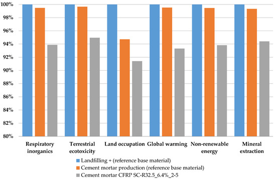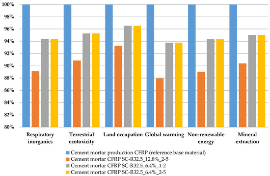 Figure 7 shows the results of the characterization comparing the baseline cement mortar and mortars with a substitution of cement. There are substantial environmental benefits depending on the amount of replaced cement. In fact, mortar with a substitution rate of 6.4% when compared to the baseline mortar present environmental benefits around 5%, while mortar with a substitution rate of 12.8% shows benefits of around 10% along the six categories.
