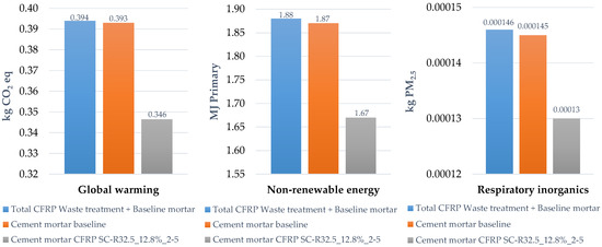 Comparison of environmental impacts by considering absolute values for three impact categories and for three cement mortars.
