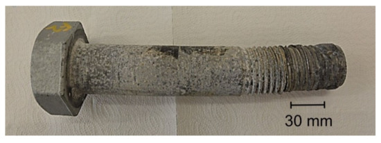 The overall view of the tested S1 bolt is shown in Figure 1. It was characterized with a secondary bend, which resulted in unacceptable shape deviations in the bolt’s shank. The arrow of the bend for the bolt was up to 2.3 mm (Figure 2).