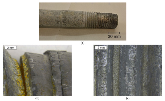 Macroscopically, the surface showed symptoms of strong white corrosion of the zinc layer of the shank and the threaded part of the bolt (Figure 6). In the location of cracks, red corrosion of the steel was also observed. The head of the bolt was free of corrosion symptoms, as was the case with the S1 bolt. The extensive area of white corrosion indicates the long-term stay of the bolt in wet conditions. It should also be noted that in this case the head of the tested bolt did not show symptoms of white corrosion. It was only the area between the bolt head and the nut, which was in contact with the steel flanges of the tower, that showed strong white corrosion. As a result of observing the S2 bolt, the appearance of cracks was seen in the thread roots located in the area under the nut. In the location of cracks, red corrosion of the steel was observed. The condition of the bolt and cracks observed in the thread roots is shown in Figure 7.