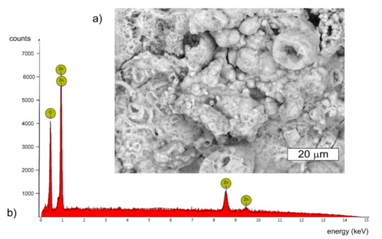 The tested bolt in the location of where the cracks appeared was covered with many corrosion products of white and brown colour (Figure 3b). White rust, also known as white corrosion, is created as a result of corrosion of the zinc coating. The type of formed products is influenced by environmental conditions. The authors agree that after long-term exposure to atmospheric conditions, occurring in the presence of carbon dioxide and in the absence of industrial pollution, the dominant products of the white corrosion of zinc and its alloys are zinc oxide ZnO, zinc hydroxide Zn(OH)2, and mainly hydrozincite Zn5(OH)6(CO3)2, which is the basic zinc carbonate. When their formation takes place in the presence of chlorine, a simonkolleite with the formula Zn5(OH)8Cl2·H2O is also formed [27,28]. The formation of corrosion products may be accompanied by the formation of smithsonite with the formula ZnCO3, or gordaite with the formula Na4Zn4SO4(OH)6Cl2·H2O [27,29,30]. In the EDX spectrum obtained from white corrosion products, no presence of aggressive ions such as chlorides, which could accelerate the corrosion, was observed (Figure 5). However, it is worth mentioning at this point that other bolts from this wind turbine tower were also tested and the presence of chlorine was observed. In the places of cracks, red corrosion of the steel was also observed, which indicates that the zinc layer in these locations was not protecting the steel against corrosion.