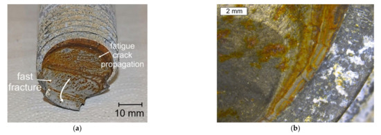 The failure of the bolts was caused by fatigue crack growth in their threaded part. The general view of the fractures reveals a distinct fatigue crack propagation region and a fast fracture region with pronounced beach marks (Figure 8). The fracture differed from that observed by other authors [11] and caused by hydrogen-induced stress corrosion cracking. The fatigue propagation area was located near the extreme circumference of the bolt. The crack initiated at the thread root and was probably caused by the presence of microcracks, as was also observed in the thread roots of all the tested bolts. Two different rates of fracture development in the fatigue crack propagation region can be observed. In the first phase, this zone did not develop fast and the surface corroded. In the second phase, the rate of crack growth increased, and the fatigue crack propagation region shows much lower features of the corrosion. The bolts showed slight deformation in the fast fracture area, which was also a result of the bolts breaking during the crash (shown by the arrow at Figure 8a).