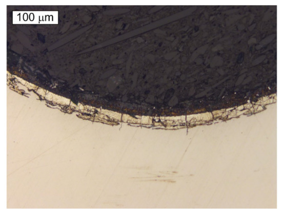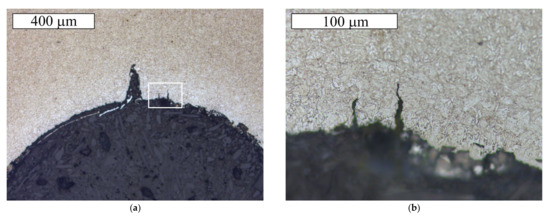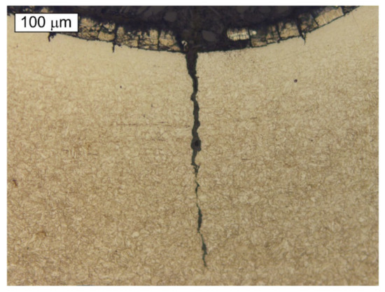The microscopic observations of the S2 bolt were performed at the longitudinal sections of its threaded parts in non-etched and etched states. Figure 12 and Figure 13 present exemplary cracks that were observed in the S2 bolt’s thread root. It is very clear that the fracture initiates in the thread root region. Similarly, as in the case of the cracks observed in the material of the remaining bolts, it can be noted that the cracks occurring in the material of the S2 bolt are accompanied by cracks of the zinc coating in the same direction. It was apparent from an examination of the metallographic specimen that crack-like defects were created in the thread roots by a corrosion cracking mechanism. The cracks started at the surface of the root and ran into the bolt’s core.