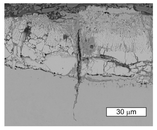 The SEM image of the zinc layer observed in the thread root of the S1 bolt is presented in Figure 11. The image shows the crack in the bolt material beginning at the notch surface. It can be observed that the radial crack of the zinc coating also occurs in the place of the bolt material crack. The crack observed in the steel and the crack observed in the coating run almost along one line and act like their own extensions. The opening of the zinc crack suggests that the initiation of the crack happened on the surface of the layer, and also that the resulting crack running through the zinc coating and the screw material is filled with corrosion products. The thickness of the zinc coating at the threads, determined using the microscopy method, was about 40 µm.