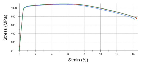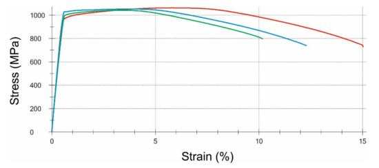 Stress-strain curves obtained for three specimens taken from the S2 bolt.