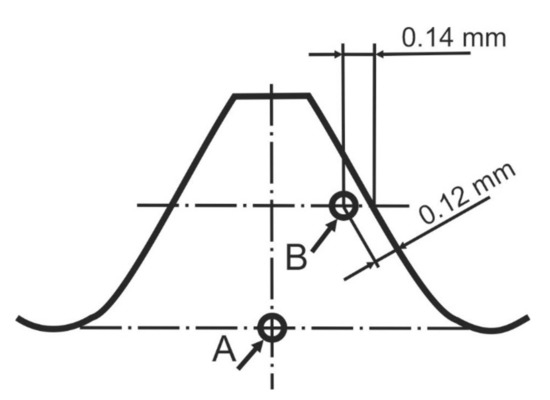 For the bolt of property class 8.8 to 12.9, decarburization and carburization tests should be performed. The measurement of carburization aims to check whether the surface of an element was enriched with carbon during the heat treatment. According to recommendations of the EN ISO 898-1:2013 standard, evaluation of carburization was performed with application of the hardness measurement method at the longitudinal sections of the threaded areas of the S1 and S2 bolts. The assessment is made on the basis of the comparison of the hardness obtained at the height of internal diameter of the thread and the hardness obtained at the height of the thread’s pitch. The standard recommends performing the measurements by means of the Vickers method using a load of 300 g. The HV0.3 microhardness measurements of the longitudinal sections of the S1 and S2 bolts were performed in locations A and B shown in Figure 16. The condition specified by the standard HV(B) ≤ HV(A) + 30 HV is met for both the tested bolts S1 and S2 (Table 2). No carburization of the threads was found.