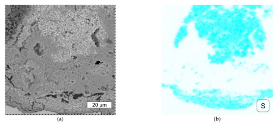(a) SEM image of the deposit observed on the cross-section of the S1 bolt thread surface. An enlarged area from Figure 17a, BSD (b) Distributions of sulphur obtained in the mapping performed at the area presented, SEM/EDX.