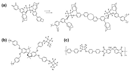 Structures of (a) crosslinked PFCB polymer from a monomer obtained by combining adamantyl, PFCB, and benzocyclobutene groups [31], (b) PFCB-containing spiro-centered polymer [32], and (c) PFCB-based polyimide [33].