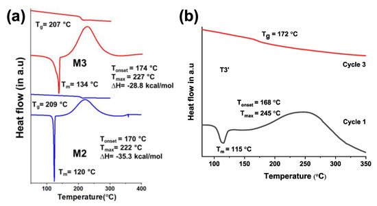 Although PFCB polymers have been prepared from TFVE aromatic monomers containing a wide range of different functional groups, only a few studies have reported PFCBs with extended or fused aromatic segments [47,64]. Recently, our group has made efforts in synthesizing PFCBs containing large polycyclic aromatic hydrocarbons (PAHs) [48,49]. Displayed in Scheme 13 are the PAH-containing PFCB polymers prepared from TFVE precursor monomers using inexpensive acenaphthylene derivatives [48]. The resulting PFCB polymers can be easily formed into thin films with high molecular weight, glass transition temperature (Tg) above 200 °C (Figure 2a), and thermal stability of up to 450 °C. Likewise, Scheme 14 shows the utility of bisphenol-based PAHs in the preparation of new PFCB polymers, which exhibited variable Tg values and high thermal resistance in both air and N2 [49]. As shown in Figure 2b, the first heating cycle of the telechelic polymer triggered two thermal events: a broad polymer endotherm occurring at 115 °C, followed by a slow polymerization onset at 168 °C, with a maximum at 245 °C. These PFCB polymers also contain intact enchained fluoroalkenylene moieties susceptible to further post-polymerization and crosslinking. In general, the inclusion of PAH cores into PFCBs results in polymers with higher thermal stability compared to polymers prepared from conventional precursors.