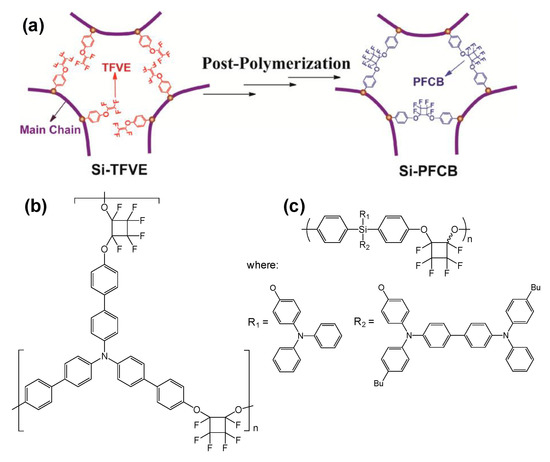 (a) Preparation of amorphous polysiloxane crosslinked with PFCBs. Reprinted from [28] with permission from ACS. Structures of (b) PFCB-containing crosslinked polyarylamine [34] and (c) BTPD-Si-PFCB as functional HTMs [35].