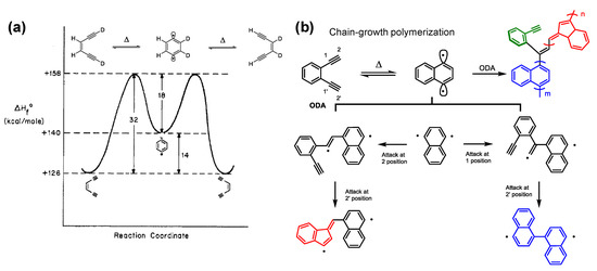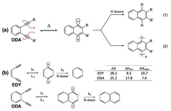 (a) Thermal cycloaromatization of ODA via the Bergman reaction in the (1) presence of abstractable heteroatoms/proton donors or (2) absence of such species, being either in solution or melt [75]. (b) EDY and ODA monomers with their corresponding experimental Bergman cyclization (ΔHrxn), retro-cyclization (ΔHretro), and proton abstraction energy barriers (ΔH) in kcal mol−1 [76].