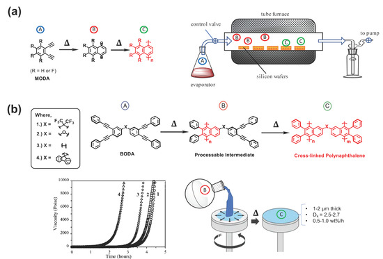 Like PFCBs, ODA-derived polymers are synthesized via a thermally initiated, ring-closing polymerization that offers several benefits: the chemistry (1) proceeds without the presence of exogenous chemical catalysts or reagents, (2) results in a high atom economy as the reaction undergoes a non-condensation process without forming volatile by-products, (3) produces polymers amenable to film-forming vapor deposition processes, and (4) includes a versatile substrate scope as a variety of monomers can be rapidly synthesized by well-established, facile metal-catalyzed coupling reactions. However, unlike the radical-mediated [2 + 2] cycloaddition of TFVEs, the polymerization of ODA monomers proceeds via a Bergman cycloaromatization to yield highly reactive aryl diradicals capable of (1) abstracting protons, (2) in the absence of a proton source, initiating other cyclization or propagation events (Scheme 15a) [76]. Although the Bergman cyclization reaction is extensively studied in the literature, within the scope of polymer science, it has been largely underutilized until recent years [77]. While the utility of Bergman cyclization in achieving novel, functional polymers has been reviewed in the literature [76,77], this section focuses on the synthesis, properties, and applications of ODA-derived thermosets and carbon.