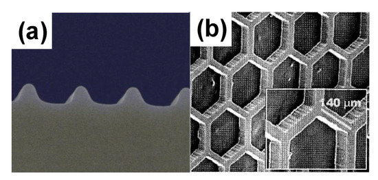Actual photonic devices composed of PFCBs were physically fabricated to illustrate the fluoropolymer’s practical functionality in such applications. Planar photonic structures capable of functioning in the visible and near-infrared spectral regions were prepared by Shah et al. [38] by patterning microscopic diffractive linear gratings into a BP PFCB polymer film through direct micromolding using a silicon master. Diffraction effects, particularly from the green to red spectral portions of the visible region, were observed from the photonic structure, with a bandwidth of 3 dB at roughly 30 nm.