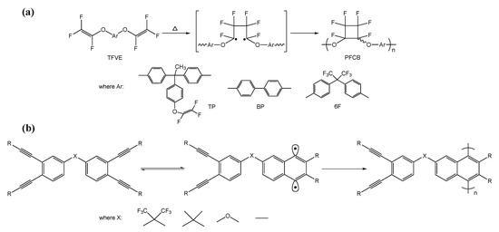 In this review, we aim to concisely highlight both PFCBs and ODA-based materials as two useful classes of aromatic and fluoroalicyclic polymers. Although these polymers have been widely discussed in the literature, the majority of the past and current reviews have focused broadly on the synthesis, properties, and industrial uses on each individual polymer [12,16,50,59]. Herein, we not only present in one review the synthetic routes toward production of new PFCB polymers (i.e., those containing large polycyclic aromatic hydrocarbons) and high carbon yielding ODA-based materials, but also emphasis on their preparation via ring formation, which leads to a remarkably unique combination of processability and performance properties. Ring-forming cyclopolymerization is attractive because it proceeds via undemanding polymerization conditions, requiring neither catalyst nor reagents, and produce little to no condensates over the course of the reaction. This naturally facile and high atom efficiency synthetic route can lead to promising mechanochemical and thermal reversibility properties, which are highly coveted for achieving stimulus-induced healing and other dynamic properties. The synthesis and properties of these polymers are first presented, followed by their use in fabricating high-performance materials for a wide range of industrial and engineering applications.