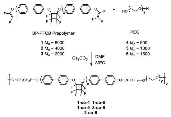 PFCB polymers are obtained by thermal [2 + 2] cyclopolymerization of TFVE-containing monomers (without using any catalysts or initiators) resulting in a four-membered perfluorocyclic ring. Our group reported, for the first time, the preparation of a series of amorphous PFCB multi-block copolymers through the formation of a fluorinated arylene vinylene ether (FAVE) bonded to a biphenyl (BP) prepared from poly(ethylene glycol) (PEG) and biphenyl-based (BP)-PFCB oligomers. The copolymers were synthesized via nucleophilic addition of hydroxyl end groups of PEG to TFVE functional groups (Scheme 2) [44]. Using NaH as base, PFCBs with unsaturated FAVE linkage rich with difluorovinylene (CF=CF) groups can be obtained. On the other hand, the utility of Cs2CO3 can result in PFCBs with stereorandom hydrofluoroethylene (CHFCF2) FAVE linkage [45]. To better understand the properties of the newly synthesized polymers, different wt% of hydroxytelechelic PEGs (4-6) and 4,4-bis(4-trifluorovinyloxy)biphenyl oligomers (1-3) were used during polymerization. The addition of higher number-average molecular weight (Mn) monomers 5 or 6 to oligomer 1 showed an increase in Mn, along with lower polydispersity of the resulting polymer. The decrease in polydispersity for 1-co-4, 1-co-5, and 1-co-6 was possibly due to the nucleophilic addition to the low molecular weight oligomer 1.