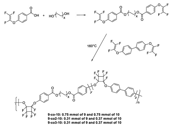 The interest in polymer blend systems with minimum preparation steps for cost-effective processes and applications has rapidly increased over the last decades [44,46,67]. Polymer blend systems, which result in new materials with properties different from their parent components, are based on the physical combination of different polymers [44,67]. Although PFCB aryl ether polymers blended with fluorinated materials have been studied in the literature, less work on PFCB aryl ether blended with nonfluorinated monomers has been reported [44,46]. Brown et al. [46] reported the compatibilization of PEG with a biphenyl perfluorocyclobutyl (BP-PFCB) aryl ether polymers (Scheme 3). Monomer 9 was synthesized in a one-step fashion via esterification of 4-(trifluorovinyloxy)benzoic acid (7) with PEG (8). Monomers 9 and 10 were thermally copolymerized via step-growth [2 + 2] cycloaddition at 160 °C, affording the BP-PFCB copolymers. The PEG/BP-PFCB blends were prepared by dissolving PEG and BP-PFCB, both with Mn ~20,000, in a 1:1 weight ratio containing 1–5 wt% compatibilizer 9-co2-10 in chloroform. Results showed that the addition of 9-co2-10 increases the compatibility of the two polymers and molecular adhesion, resulting in a polymer blend with low surface energy.