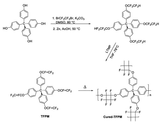 PFCB polymers with low dielectric constants (Dk) and low dissipation factors (Df) have attracted much attention because of their potential use in the manufacture of high-performance electronic devices [28,29,30,31,33,68]. Although there are different ways of lowering the Dk and Df values of polymeric materials, two of the most common techniques are (1) introducing less polarizable groups (e.g., C−H, C−C, C−Si, C−O, and C−F bonds) into the polymer backbone and (2) decreasing the material density by increasing the porosity [30,31,32]. Luo et al. [30] synthesized a new microporous PFCB aryl ether polymer from a tetrahedral structured monomer containing thermo-polymerizable TFVEs with −CF2H terminal groups (Scheme 4). Tetrakis(4-((1,2,2-trifluorovinyl)oxy)phenyl)methane (TFPM) monomer was synthesized via fluoroalkylation of 4,4,4″,4‴-methanetetrayltetraphenol, made unsaturated using lithium tetramethylpiperidine (LTMP), and thermally cured into a porous cross-linked polymer. The resulting PFCB polymer exhibited low Dk and Df values of 2.36 and 1.29 × 10−3, respectively, at a frequency of 5 GHz.