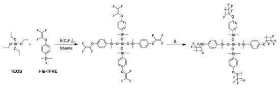 Fluorinated polysiloxanes are an important class of high-performance materials with good processability and high thermal stability [28,36,68]. They are generally prepared via the (1) ring opening of fluorinated siloxane monomer and (2) hydrosilylation reactions between polysiloxane monomers and fluorinated compounds [28,68]. Wang et al. [68] reported a novel fluorinated polysiloxane macromonomer synthesized from tetraethoxysilane (TEOS) and TFVE-containing arylhydrosilane (HSi-TFVE) via a one-step Piers Rubinsztajn reaction using B(C6F5)3 (Scheme 5). The synthesized fluorinated TEOS monomer was then polymerized to form a cross-linked PFCB-containing polysiloxane network.