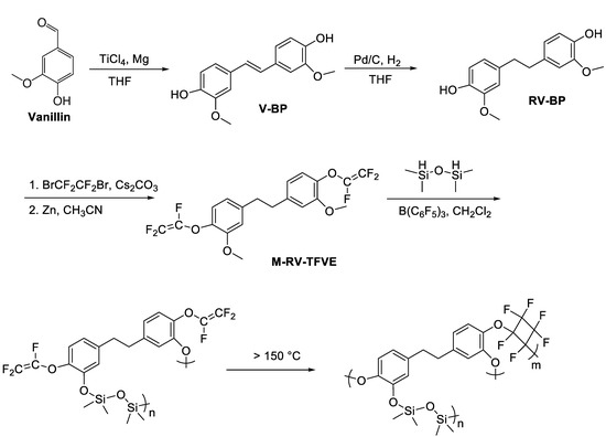 In pursuit of sustainability, Tao et al. [60] synthesized a high-performance PFCB-containing polysiloxane using vanillin as starting material. As shown in Scheme 7, the aldehyde groups of vanillin were first transformed into unsaturated bisphenol (V-BP) through a McMurry coupling reaction, followed by a double bond reduction in a Pd/C catalyst to obtain saturated bisphenol (RV-BP), and introduction of TFVE groups. The resulting monomer (M-RV-TFVE) was reacted with disiloxane in B(C6F5)3 and subsequently cured above 150 °C to obtain the PFCB-based polysiloxane thermoset. It is noteworthy that the presence of PFCB groups provided the crosslinkable polysiloxane polymer with good thermal stability and chemical resistance.