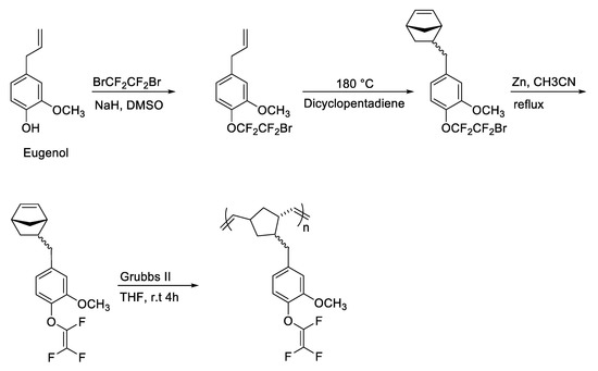 Fang et al. [61] recently reported the utility of eugenol to produce a new norbornene, TFVE-containing monomer, which can be polymerized into a crosslinked network containing PFCB moieties (Scheme 8). Eugenol has become popular as a renewable bio-feedstock for the synthesis of new high-performance materials due to its ready availability at low cost and reactive hydroxyl and unsaturated functional groups [70]. Note that the hydroxyl can be reacted to introduce fluorine-containing groups, while the double bond can undergo a Diels-Alder reaction with dicyclopentadiene. The resulting biobased PFCB polymer displayed good thermal stability, film transparency, and dielectric property.