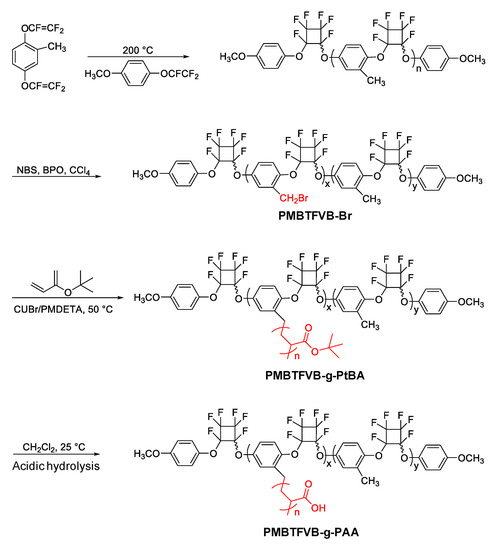 Amphiphilic copolymers are another class of macromolecules, which exhibit microscopic phase separation and self-assembly behavior at interfaces and in solution, and are mostly used as solubilizers and in drug delivery, catalysis, and packaging materials for electronics [63,71]. Among the amphiphilic copolymers, the fluorine-containing ones are popular because tailored physicochemical properties can be obtained for high-performance applications [62,63]. Liu et al. [62] prepared amphiphilic, brush-type PFCB-based graft copolymers composed of a semi-fluorinated poly(2-methyl-1,4-bistrifluorovinyloxybenzene) (PMBTFVB) backbone and hydrophilic poly(acrylic acid) (PAA) side chains through the combination of thermal cycloaddition polymerization and atom transfer radical polymerization (ATRP). As shown in Scheme 9, the target PMBTFVB-g-PAA was prepared by acidolysis of poly(tert-butyl acrylate) (PtBA) side chains of PMBTFVB-g-PtBA, which was obtained via ATRP of tBA using PMBTFVB-Br as macroinitiator. Results showed that the synthesized polymers displayed narrow molecular weight distributions and can self-assemble into peculiar nanostructures in aqueous media due to their structural features, which combine the flexible and robust aromatic ethers with fluorocarbon linkages.