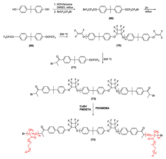 Feng et al. [63] also synthesized an amphiphilic block copolymer containing a hydrophobic PFCB center block and hydrophilic poly(ethylene glycol) methyl ether methacrylate (PEGMEMA) side blocks via thermal step-growth cyclopolymerization, followed by ATRP (Scheme 10). It can be seen that the polymer product showed two different structural segments with distinct solubility and self-assembly behavior in water. This specific amphiphilicity provided the block copolymer with the ability to form nanostructures in aqueous media via self-assembly.