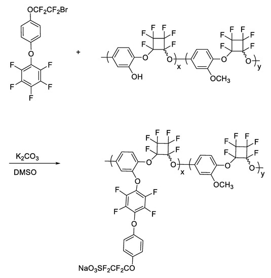 - Bi, L.; Hong, J.; Li, S.; Zhu, Z.; Zhu, Y. Post-Functionalization of Perfluorocyclobutyl Aryl Ether Polymers with a Novel Perfluorosulfonated Side Chain Precursor. J. Polym. Res. 2019, 26, 1–9. [Google Scholar] [CrossRef]