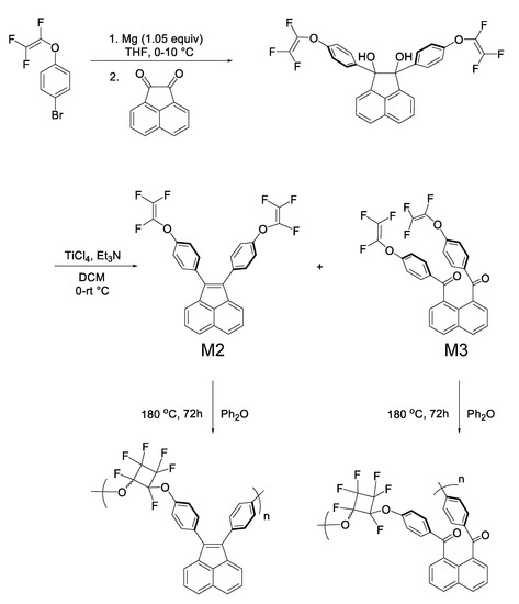 - Farajidizaji, B.; Shelar, K.E.; Narayanan, G.; Mukeba, K.M.; Donnadieu, B.; Pittman, C.U., Jr.; Sygula, A.; Smith, D.W., Jr. Acenaphthylene-derived Perfluorocyclobutyl Aromatic Ether Polymers. J. Polym. Sci. A Part Polym. Chem. 2019, 57, 1270–1274. [Google Scholar] [CrossRef]