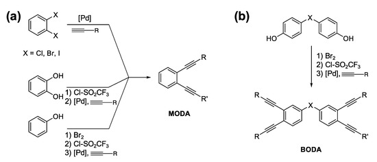 Mono- and bis-ortho-diynylarenes (MODA and BODA) are the nomenclatures assigned to the bifunctional and crosslinkable monomers, respectively. MODAs can be easily synthesized from ortho-dihaloaromatic precursors (Scheme 16a) in a one-step Sonogashira coupling. Typically, bromo- and iodoaryl substrates are preferred, but a modified Sonogashira reaction can also make use of chlorinated aryl substrates [88] for access to a larger pool of starting materials (e.g., polychlorinated biphenyls). Likewise, naturally based catechols are inexpensive precursors, requiring a two-step conversion to MODA (Scheme 16a) [89].